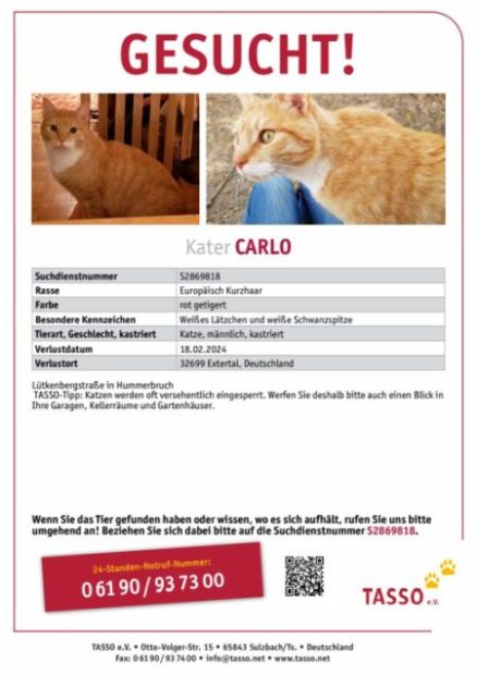 Kater Carlo wird seit 19.02. in Extertal vermisst.