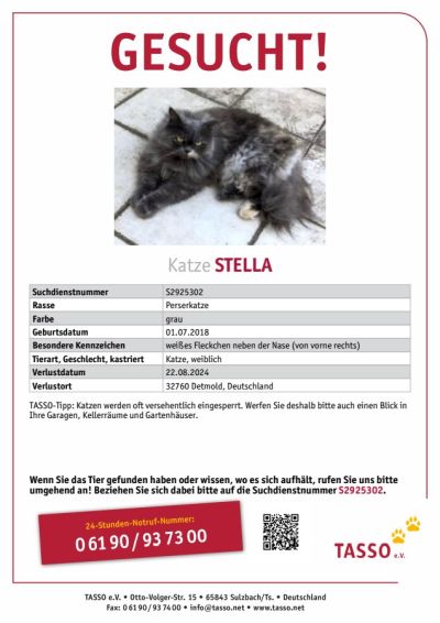 Die Perserkatze Stella wird seit 22.08. in Detmold vermisst.
