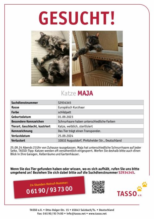 wir vermissen schmerzlich seit dem 25.09.24 unsere Katze Maja. Sie ist an der Pivitsheiderstraße in Augustdorf entlaufen. Maja ist gechippt, sterilisiert und bereits bei Tasso als vermisst gemeldet.