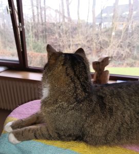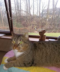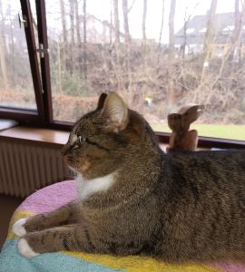 Allmählich bin ich nicht mehr so scheu, und mit Fressen werde ich überlistet. Ich bin gut erzogen und habe immer zwei saubere Toiletten, an der Leine darf ich sogar raus, aber drei Wochen muss ich noch durch das große Fenster gucken.