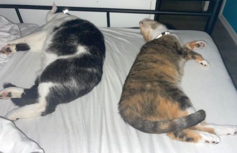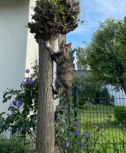 Meine Geduld - und auch die des Katers - haben sich gelohnt: mittlerweile bleibt sie auch bei verschlossener Terassentür im Garten und beobachtet Insekten. Sie rennt die Treppe wie verrückt hoch und runter und liegt (verbotenerweise) mit dem Kater nachts im Bett. Draußen hat sie das Klettern in Bäumen für sich entdeckt. Sie wirkt fröhlich, ist entspannt und lässt sich sogar mittlerweile nicht nur von mir streicheln.