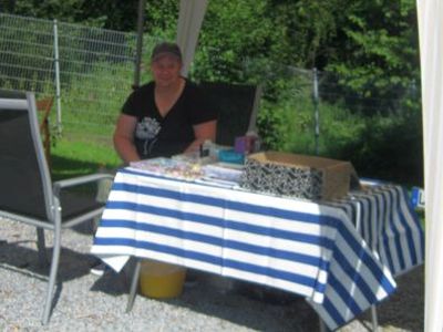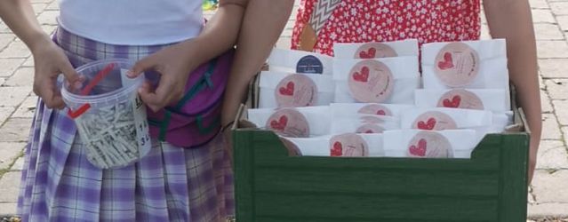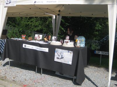 Unterstützt von ihren Eltern Thomas und Regina, boten die bezaubernden Schwestern Käthe und Leni Riedel am eigenen Stand und mit ihrem Bauchladen wieder selbstgemalte Tierbilder und selbstgebackene Hundekekse zugunsten unserer Tierheimtiere feil, die dem Urteil der Vierbeiner zufolge sehr wohlschmeckend sein müssen.